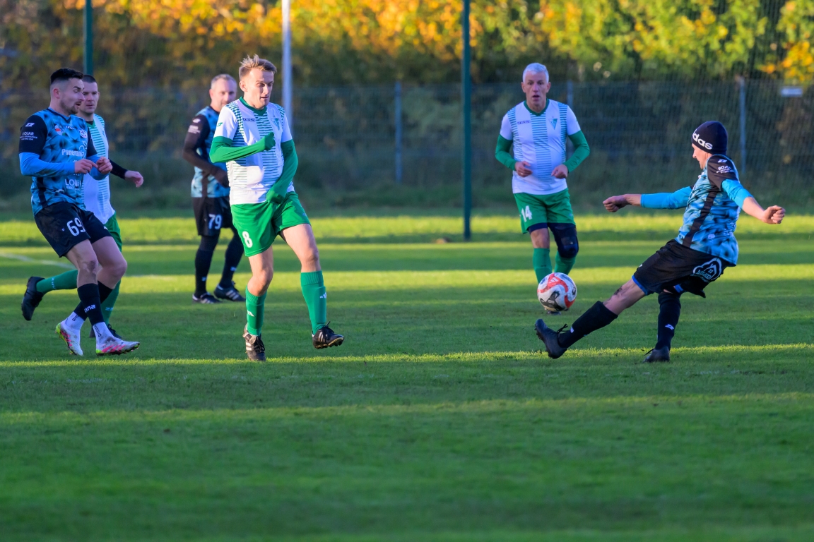 Nasza drużyna dostaje duży impuls i końcówka pierwszej połowy przenosi się na połowę przeciwnika, gdzie po akcji krótkimi podaniami dochodzimy pod bramkę gości, jednak Marcel Tuziemski strzela minimalnie obok bramki.