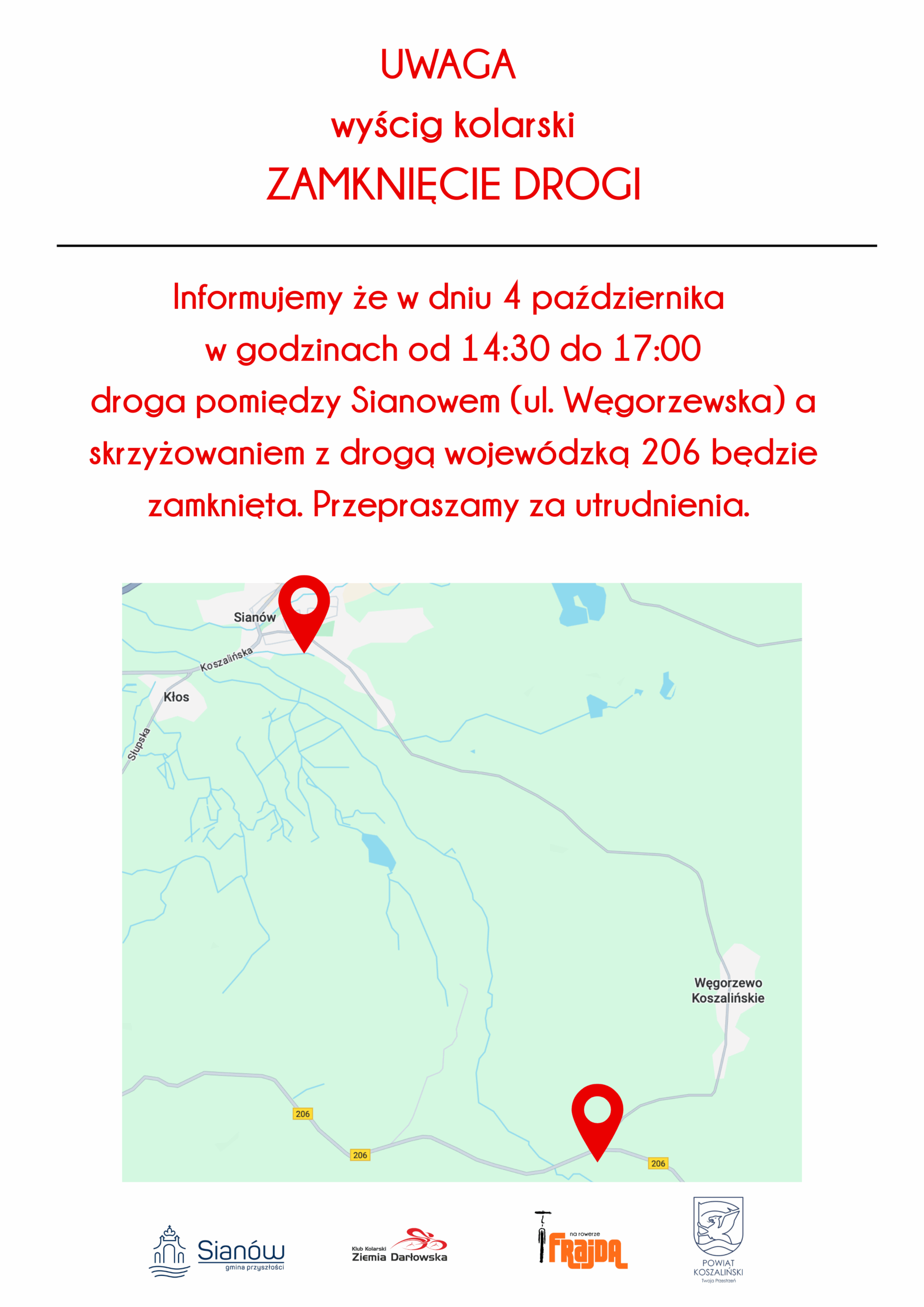 Informujemy że w dniu 4 października w godzinach od 14:30 do 17:00 droga pomiędzy Sianowem (ul. Węgorzewska) a skrzyżowaniem z drogą wojewódzką 206 będzie zamknięta.